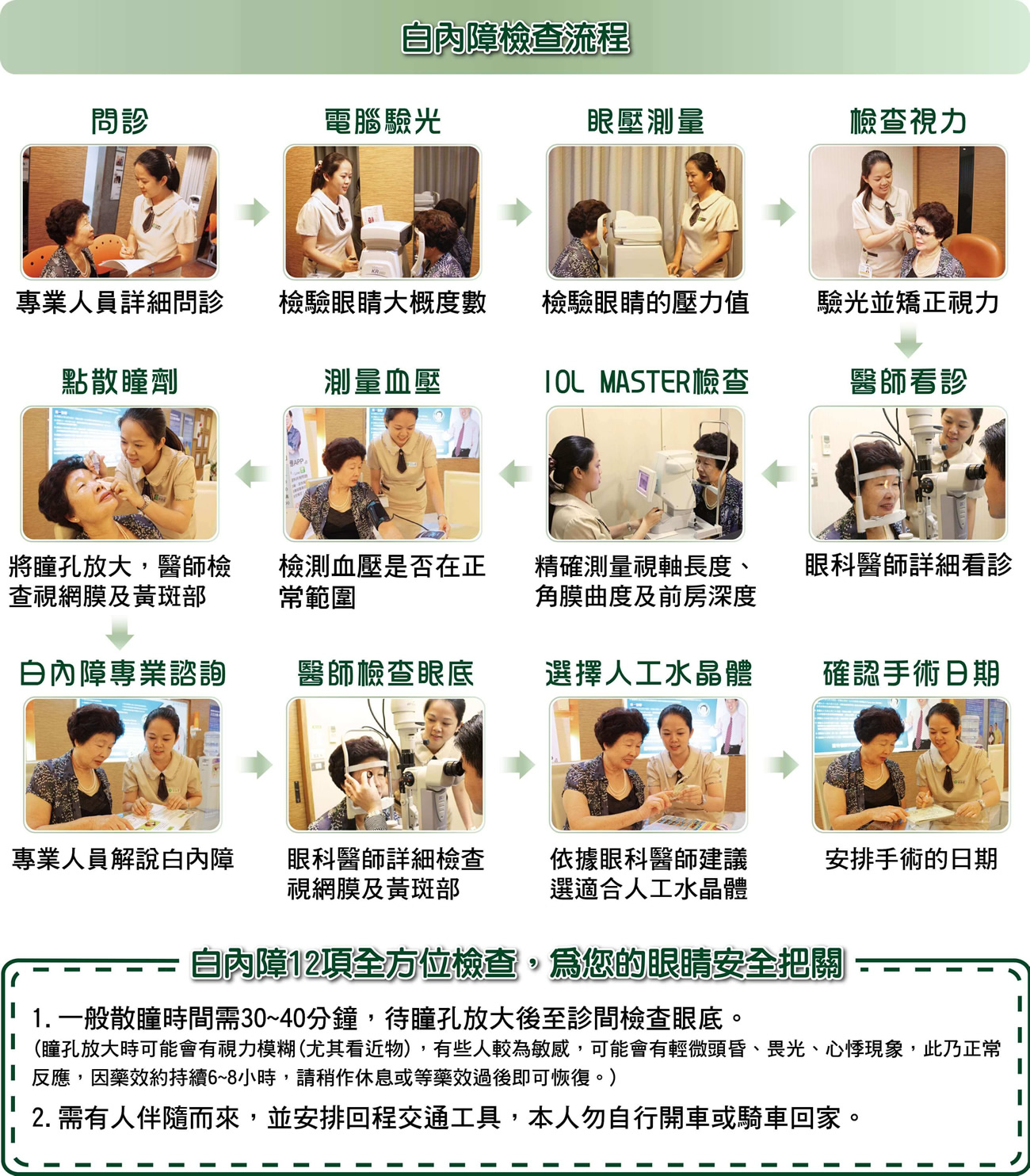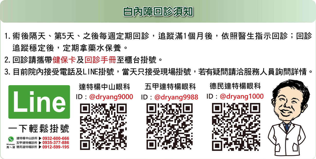 除非是很嚴重的白內障,瞳孔看起來不再是黑色,而是呈現白色或黃色,否則仍需由眼科醫師借助儀器的輔助來確定水晶體混著的形狀,大小及位置。